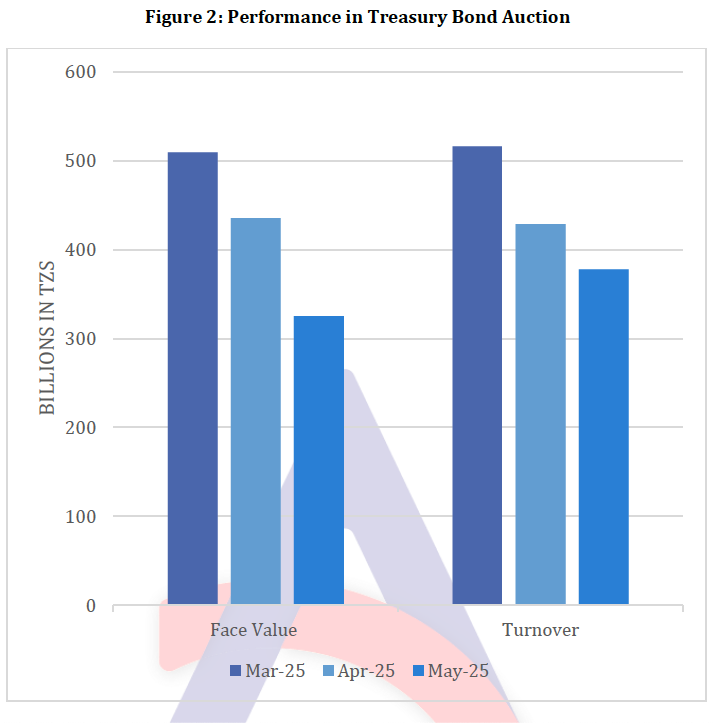 In May 2025, the bond market exhibited mixed performance, marked by strong participation in primary market auctions alongside a decline in activity in the secondary market. The Bank of Tanzania (BoT) reopened two bonds that met